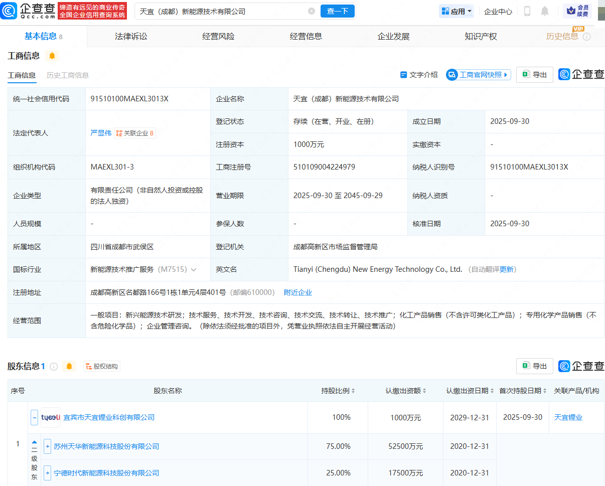 近日尚求100,天宜(成都)新能源技术有限公司成立,法定代表人为严显伟,注册资本为1000万元,经营范围包含:新兴能源技术研发;专用化学产品销售(不含危险化学品);企业管理咨询等。企查查股权穿透显示,该公司由宜宾市天宜锂业科创有限公司全资持股,后者由天华新能(300390)、宁德时代(300750)间接共同持股。